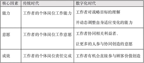 傳統(tǒng)時(shí)代和數(shù)字化時(shí)代,影響工作者成效的三個(gè)核心因素,內(nèi)涵變化見下表: