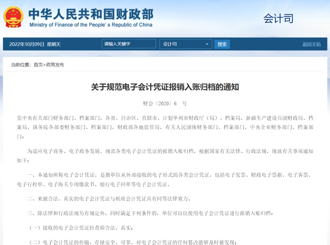 《財政部 國家檔案局 關于規范電子會計憑證報銷入賬歸檔的通知》,規范各類電子會計憑證的報銷入賬歸檔;