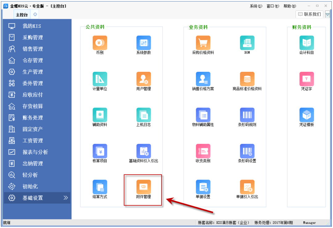 - 在系統【基礎設置】的【公共資料】中,增加【附件管理】入口。