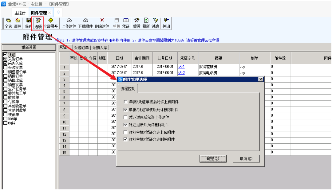 - 系統支持針對單據的不同狀態控制附件的操作權,包含單據/憑證審核后允許上傳和刪除附件、憑證過賬后允許上傳和刪除附件、往期單據/憑證允許上傳和刪除附件。