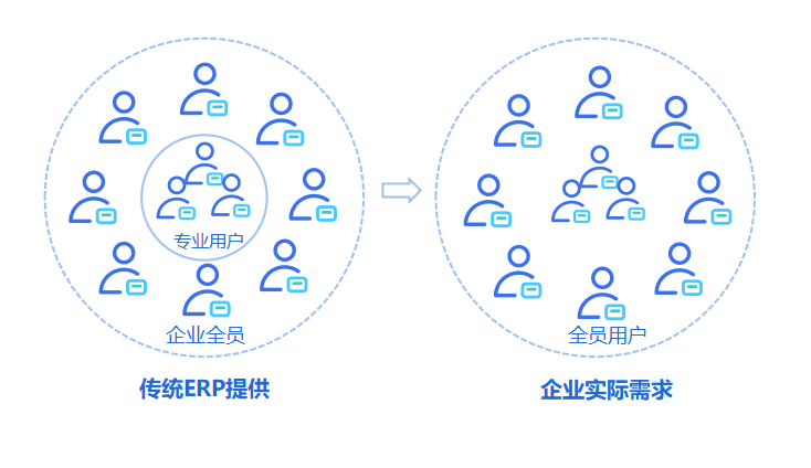中國企業的發展,從來不是以簡單的管控落地為目的,而是相信每個員工都是有力量的;而在傳統軟件模式下,一個200人的系統中,最多有20個專業用戶在系統操作,大量的員工被“隔離”在數字成果之外。在數字時代,系統應該有如費用、資金、分析等一系列直達前端的員工服務,賦能員工更高效便捷地完成工作。