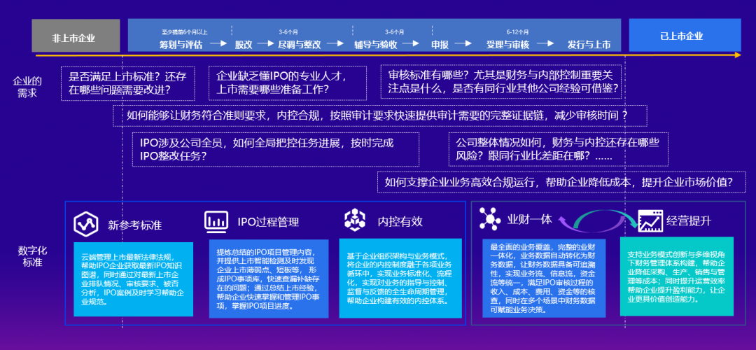 IPO企業對數字化的要求,不僅僅是滿足上市審核的合規要求,還需要支撐企業現在和未來的業務發展,很多企業在準備上市的時候,會面臨很多問題,比如企業能不能滿足上市板塊的要求?企業哪里還有問題?哪些地方不規范?能夠讓企業搞清楚在準備上市過程中,看清現狀、看到差距、明確方向和改進措施。數字化的建設要考慮這些需求,它應該是一個數字化平臺,核心建設思想是數字鏈接、合規智能、賦能經營,同時,還應該滿足以下五個標準。