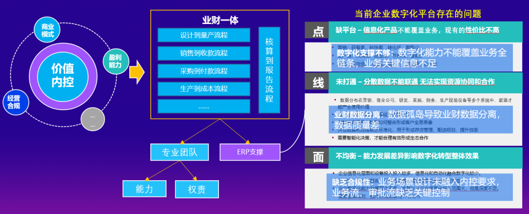 第一是數字化業務系統支撐不夠,最后由財務來兜底,業務發生了財務只能根據原始資料在總賬記錄財務憑證,導致業務數據沒有,財務數據與業務不連貫;